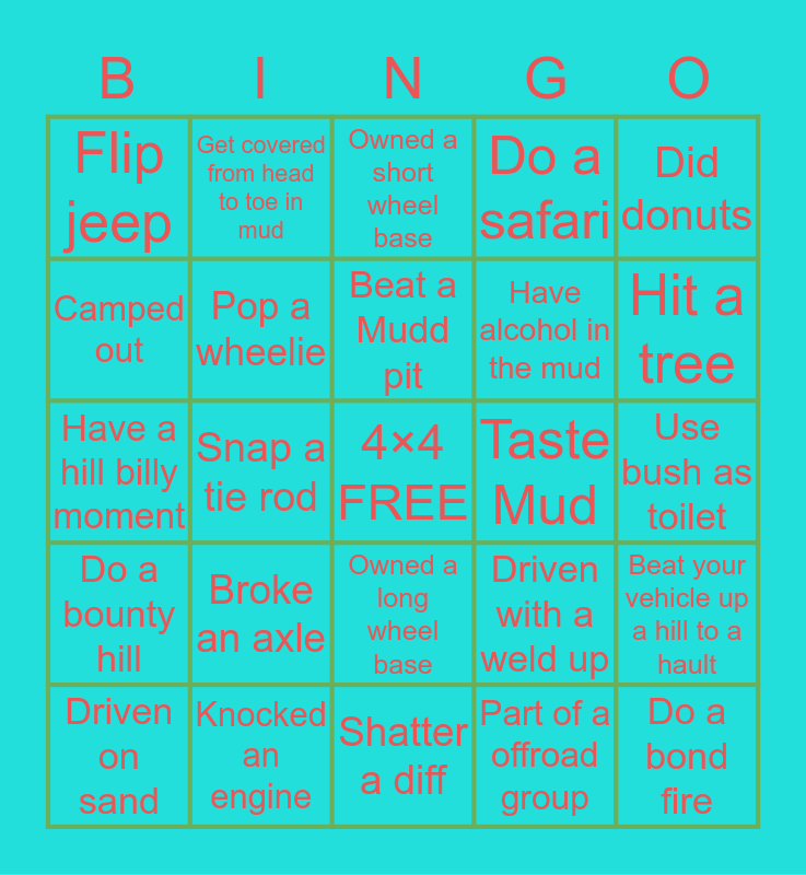 This bingo card has a free space and 24 words: Broke an axle, Knocked an engine, Beat a Mudd pit, Driven on sand, Did donuts, Flip jeep, Camped out, Get covered from head to toe in mud, Taste Mud, Owned a long wheel base, Have alcohol in the mud, Have a hill billy moment, Driven with a weld up, Beat your vehicle up a hill to a hault, Pop a wheelie, Part of a offroad group, Use bush as toilet, Owned a short wheel base, Hit a tree, Snap a tie rod, Do a bond fire, Do a bounty hill, Do a safari and Shatter a diff.