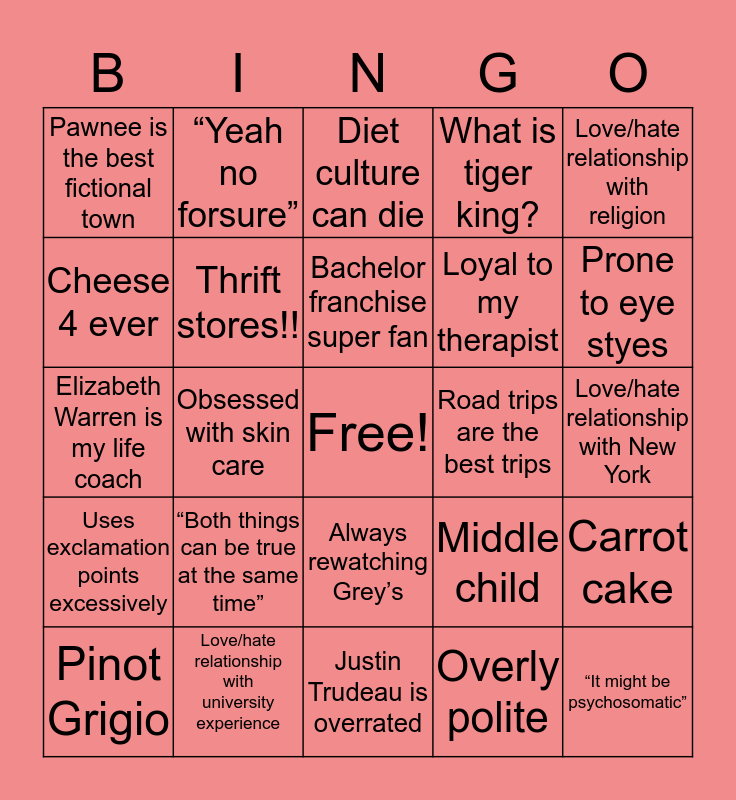 This bingo card has a free space and 24 words: “Both things can be true at the same time”, Love/hate relationship with university experience, Bachelor franchise super fan, Pinot Grigio, Love/hate relationship with religion, Pawnee is the best fictional town, Cheese 4 ever, “Yeah no forsure”, Road trips are the best trips, Always rewatching Grey’s, Loyal to my therapist, Elizabeth Warren is my life coach, Middle child, Carrot cake, Thrift stores!!, Overly polite, Love/hate relationship with New York, Diet culture can die, Prone to eye styes, Obsessed with skin care, “It might be psychosomatic”, Uses exclamation points excessively, What is tiger king? and Justin Trudeau is overrated.