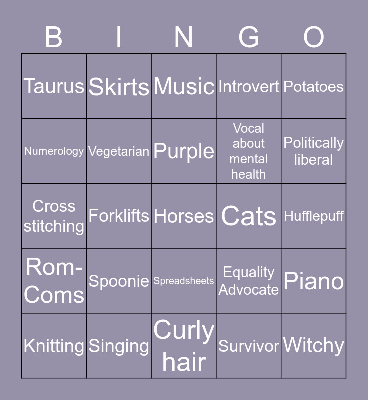 This bingo card has 25 words: Spoonie, Curly hair, Purple, Knitting, Potatoes, Taurus, Numerology, Skirts, Cats, Spreadsheets, Vocal about mental health, Cross stitching, Equality Advocate, Piano, Vegetarian, Witchy, Hufflepuff, Music, Politically liberal, Forklifts, Horses, Singing, Rom-Coms, Introvert and Survivor.