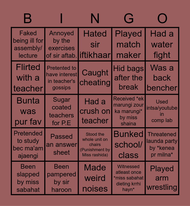 This bingo card has a free space and 39 words: Received *gadhay* from sir haider, Been a prefect, Said garam anday during class, Pretented to have interest in teacher's gossips, Been slapped by miss sabahat, Stood the whole unit on chairs (Punishment by Miss rashida), Caught cheating, Had a blast in computer/ bio's unit, Had a water fight, Pretended to study bec ma'am ajaengi, Sugar coated teachers for P.E, Played match maker, Played arm wrestling, Used intsa/youtube in comp lab, Received *ek marungi zour ka marungi* by miss shaina, Passed an answer sheet, Hid in the bathroom with a friend, Faked being ill for assembly/ lecture, Took slefies in the mirror, Bunked school/ class, Flirted with a teacher, Made weird noises, Hid bags after the break, Was a back bencher, Stood outside the school for getting late, Been bullied, Been late on purpose bec picnic sey wapas nh ana, Bought lunch from umair bhai On credit, Drew diagrams for your mates (practical j), Annoyed by the exercises of sir aftab., Celebrated a bday in school hours, Laughed between addressing the speech, Hated sir iftikhaar, Been pampered by sir haroon, Witnessed atleast once *miss sabahat dieting krrhi hayn*, Took all the bulbs out of your class/damaged school's property., Threatened launda party by *kenea pr milna*, Bunta was pur fav and Bought cocomo and chilli millies to eat during class.