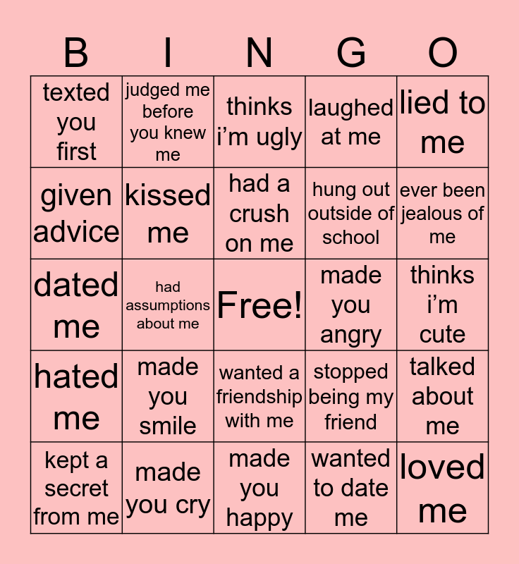 This bingo card has a free space and 24 words: made you smile, made you cry, had a crush on me, kept a secret from me, lied to me, texted you first, given advice, judged me before you knew me, made you angry, wanted a friendship with me, hung out outside of school, dated me, stopped being my friend, talked about me, kissed me, wanted to date me, thinks i’m cute, thinks i’m ugly, ever been jealous of me, had assumptions about me, loved me, hated me, laughed at me and made you happy.