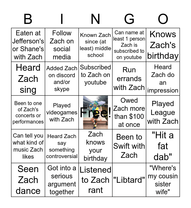 This bingo card has a free space and 24 words: Heard Zach say something controversial, Got into a serious argument together, Subscribed to Zach on youtube, Seen Zach dance, Knows Zach's birthday, Eaten at Jefferson's or Shane's with Zach, Heard Zach sing, Follow Zach on social media, Owed Zach more than $100 at once, Zach knows your birthday, Run errands with Zach, Been to one of Zach's concerts or performances, Been to Swift with Zach, "Hit a fat dab", Added Zach on discord and/or skype, "Libtard", Played League with Zach, Known Zach since (at least) middle school, Heard Zach do an impression, Played videogames with Zach, "Where's my cousin sister wife", Can tell you what kind of music Zach likes, Can name at least 1 person Zach is subscribed to on youtube and Listened to Zach rant.