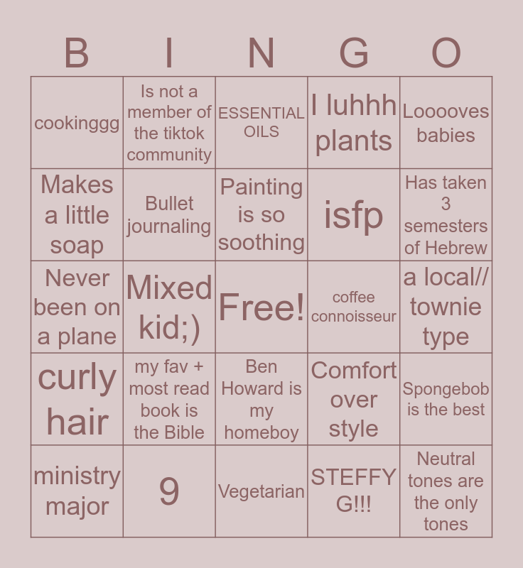 This bingo card has a free space and 24 words: ministry major, my fav + most read book is the Bible, Painting is so soothing, STEFFY G!!!, Looooves babies, cookinggg, Is not a member of the tiktok community, ESSENTIAL OILS, coffee connoisseur, a local// townie type, Never been on a plane, Bullet journaling, Comfort over style, Spongebob is the best, Makes a little soap, 9, Vegetarian, I luhhh plants, Has taken 3 semesters of Hebrew, curly hair, Mixed kid;), Ben Howard is my homeboy, isfp and Neutral tones are the only tones.