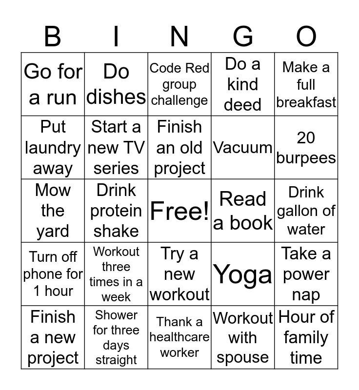 This bingo card has a free space and 24 words: Workout three times in a week, Shower for three days straight, Finish an old project, Finish a new project, Make a full breakfast, Go for a run, Put laundry away, Do dishes, Read a book, Try a new workout, Vacuum, Mow the yard, Yoga, Take a power nap, Start a new TV series, Workout with spouse, Drink gallon of water, Code Red group challenge, 20 burpees, Drink protein shake, Hour of family time, Turn off phone for 1 hour, Do a kind deed and Thank a healthcare worker.