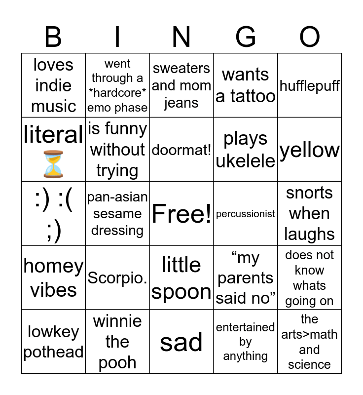 This bingo card has a free space and 24 words: Scorpio., winnie the pooh, doormat!, lowkey pothead, hufflepuff, loves indie music, literal⏳, went through a *hardcore* emo phase, percussionist, little spoon, plays ukelele, :) :( ;), “my parents said no”, does not know whats going on, is funny without trying, entertained by anything, snorts when laughs, sweaters and mom jeans, yellow, pan-asian sesame dressing, the arts>math and science, homey vibes, wants a tattoo and sad.