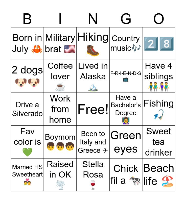 This bingo card has a free space and 24 words: Boymom 👦👦🧒, Raised in OK 🌪, Lived in Alaska🏔, Married HS Sweetheart💑, 2️⃣8️⃣, Born in July 🦀, 2 dogs🐶🐶, Military brat 🇺🇲, Have a Bachelor's Degree 👩🏫, Been to Italy and Greece ✈, F•R•I•E•N•D•S📺, Drive a Silverado, Green eyes, Sweet tea drinker, Coffee lover ☕, Chick fil a 🐄, Fishing🎣, Hiking🥾, Have 4 siblings👬👫, Work from home, Beach life 🏖, Fav color is 💚, Country music🎶 and Stella Rosa 🍷.