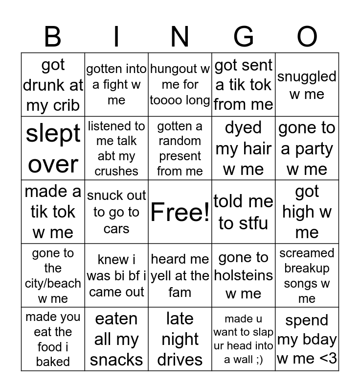 This bingo card has a free space and 24 words: knew i was bi bf i came out, eaten all my snacks, gotten a random present from me, made you eat the food i baked, snuggled w me, got drunk at my crib, slept over, gotten into a fight w me, told me to stfu, heard me yell at the fam, dyed my hair w me, made a tik tok w me, gone to holsteins w me, screamed breakup songs w me, listened to me talk abt my crushes, made u want to slap ur head into a wall ;), got high w me, hungout w me for toooo long, gone to a party w me, snuck out to go to cars, spend my bday w me <3, gone to the city/beach w me, got sent a tik tok from me and late night drives.