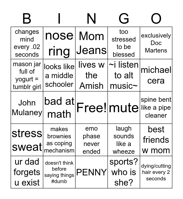 This bingo card has a free space and 24 words: ur dad forgets u exist, makes brownies as coping mechanism, lives w the Amish, sports? who is she?, exclusively Doc Martens, changes mind every .02 seconds, nose ring, Mom Jeans, mute, spine bent like a pipe cleaner, John Mulaney, looks like a middle schooler, laugh sounds like a wheeze, best friends w mom, mason jar full of yogurt = tumblr girl, doesn't think before saying things #dumb, PENNY, too stressed to be blessed, michael cera, stress sweat, bad at math, emo phase never ended, ~i listen to alt music~ and dying/cutting hair every 2 seconds.