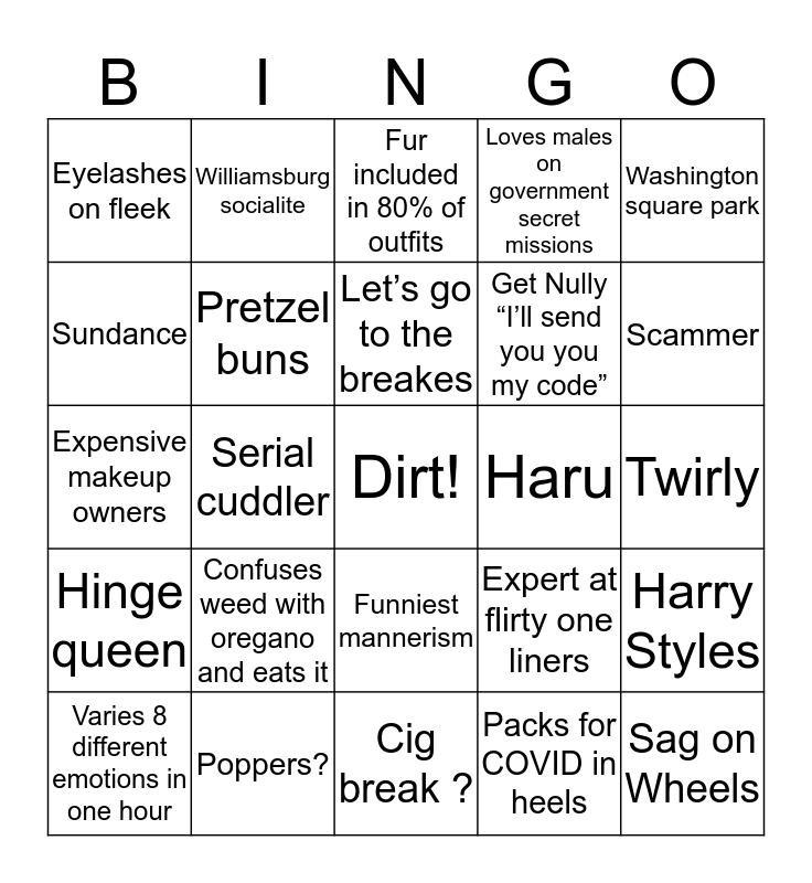 This bingo card has a free space and 24 words: Confuses weed with oregano and eats it, Poppers?, Let’s go to the breakes, Varies 8 different emotions in one hour, Washington square park, Eyelashes on fleek, Sundance, Williamsburg socialite, Haru, Funniest mannerism, Get Nully “I’ll send you you my code”, Expensive makeup owners, Expert at flirty one liners, Harry Styles, Pretzel buns, Packs for COVID in heels, Twirly, Fur included in 80% of outfits, Scammer, Serial cuddler, Sag on Wheels, Hinge queen, Loves males on government secret missions and Cig break ?.