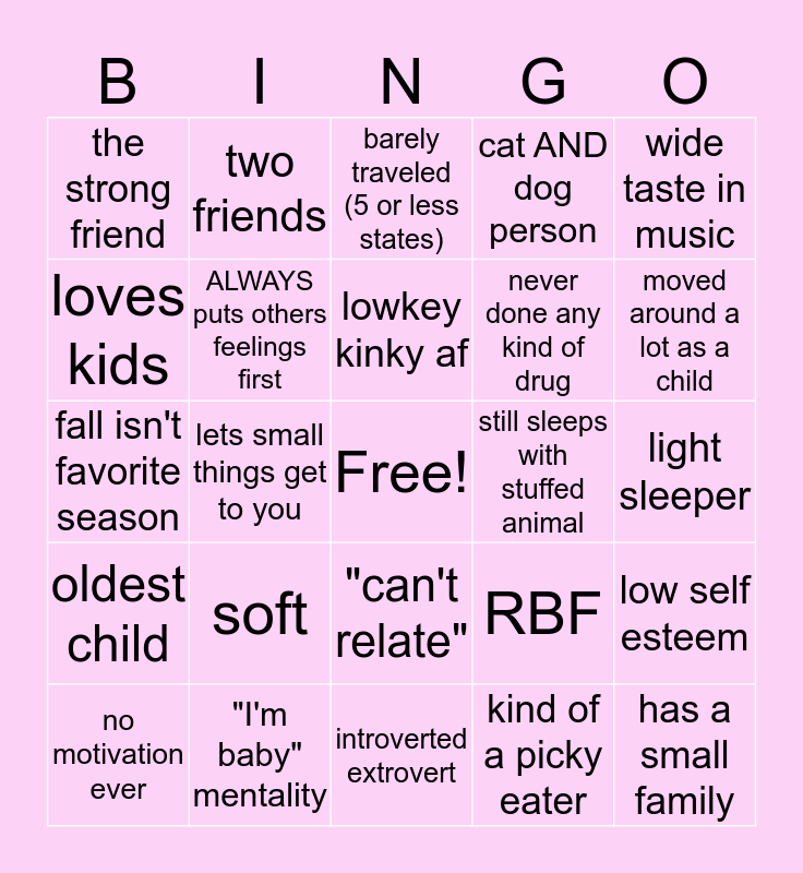 This bingo card has a free space and 24 words: soft, "I'm baby" mentality, lowkey kinky af, no motivation ever, wide taste in music, the strong friend, loves kids, two friends, still sleeps with stuffed animal, "can't relate", never done any kind of drug, fall isn't favorite season, RBF, low self esteem, ALWAYS puts others feelings first, kind of a picky eater, light sleeper, barely traveled (5 or less states), moved around a lot as a child, lets small things get to you, has a small family, oldest child, cat AND dog person and introverted extrovert.