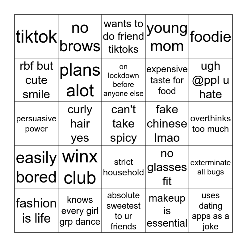 This bingo card has a free space and 24 words: winx club, knows every girl grp dance, on lockdown before anyone else, fashion is life, foodie, tiktok, rbf but cute smile, no brows, fake chinese lmao, strict household, expensive taste for food, persuasive power, no glasses fit, exterminate all bugs, plans alot, makeup is essential, overthinks too much, wants to do friend tiktoks, ugh @ppl u hate, curly hair yes, uses dating apps as a joke, easily bored, young mom and absolute sweetest to ur friends.