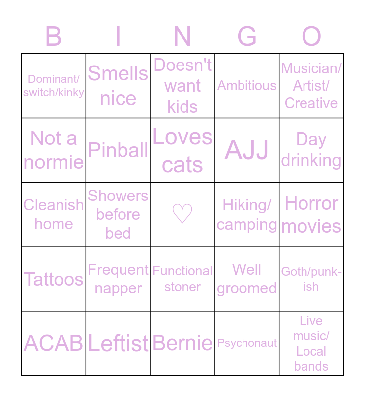 This bingo card has a free space and 24 words: Frequent napper, Leftist, Loves cats, ACAB, Musician/ Artist/ Creative, Dominant/ switch/kinky, Not a normie, Smells nice, Hiking/ camping, Functional stoner, AJJ, Cleanish home, Well groomed, Goth/punk-ish, Pinball, Psychonaut, Horror movies, Doesn't want kids, Day drinking, Showers before bed, Live music/ Local bands, Tattoos, Ambitious and Bernie.
