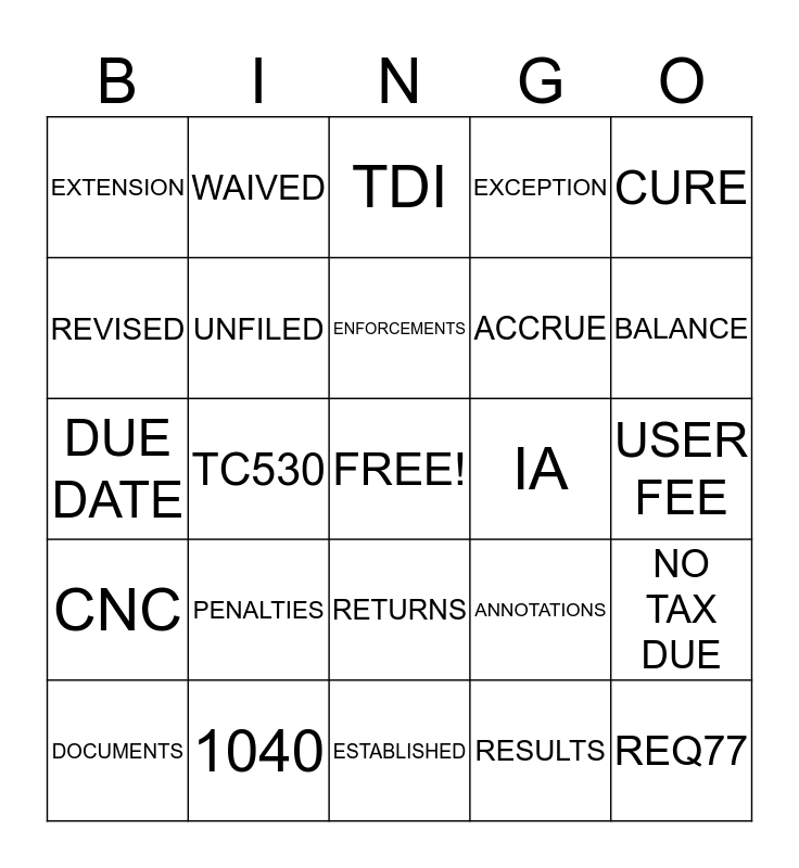 This bingo card has a free space and 39 words: TELEPHONE, COMPLIANCE, FCC, UNFILED, DOCUMENTS, RETURNS, ENFORCEMENTS, CAUSE, CURE, CNC, TC530, EXCEPTION, REQ77, USER FEE, IA, PENALTIES, INTEREST, EXTENSION, TERMS, ANNOTATIONS, REVISED, ESTABLISHED, ACCRUE, BALANCE, REINSTATE, DIRECT PAY, DDIA, PDIA, SKIPS, WAIVED, WITHHOLDING, CREDIT CARD, TDI, 1040, RESULTS, COMPLIANT, NO TAX DUE, DUE DATE and DEFAULT.