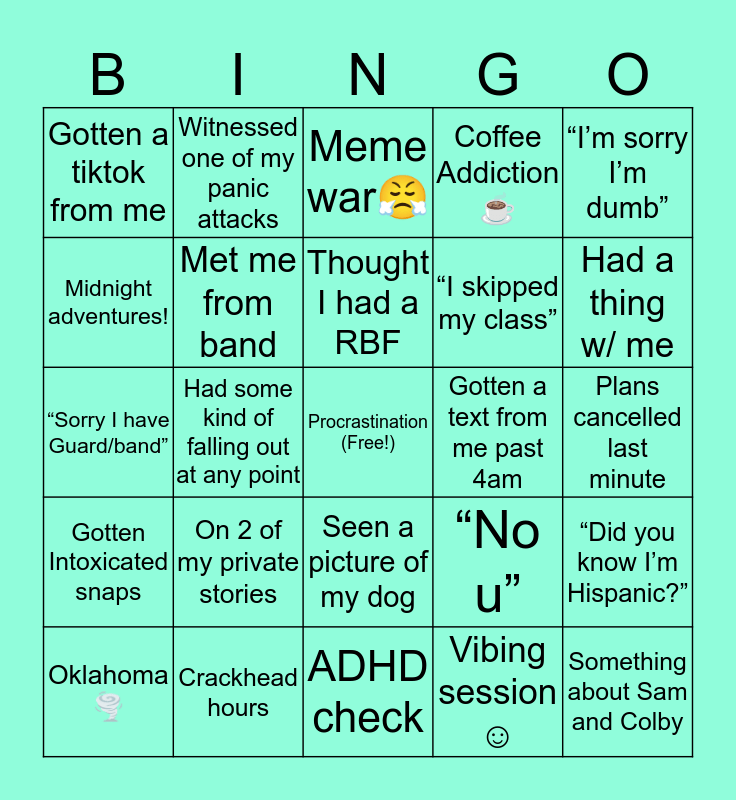 This bingo card has a free space and 24 words: On 2 of my private stories, Crackhead hours, Thought I had a RBF, Oklahoma🌪, “I’m sorry I’m dumb”, Gotten a tiktok from me, Midnight adventures!, Witnessed one of my panic attacks, Gotten a text from me past 4am, Seen a picture of my dog, “I skipped my class”, “Sorry I have Guard/band”, “No u”, “Did you know I’m Hispanic?”, Met me from band, Vibing session ☺️, Plans cancelled last minute, Meme war😤, Had a thing w/ me, Had some kind of falling out at any point, Something about Sam and Colby, Gotten Intoxicated snaps, Coffee Addiction ☕️ and ADHD check.
