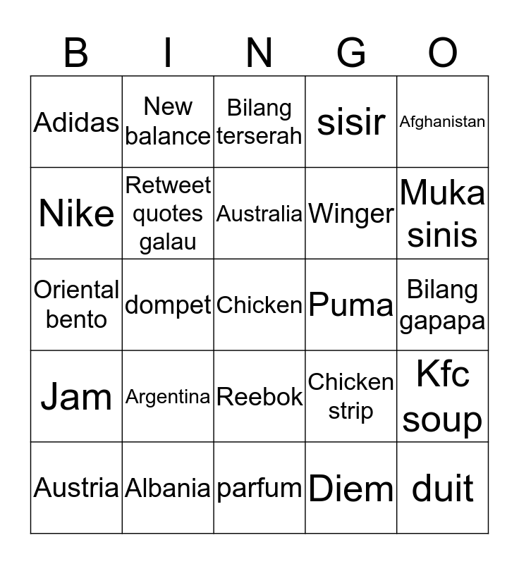 This bingo card has a free space and 24 words: Argentina, Albania, Australia, Austria, Afghanistan, Adidas, Nike, New balance, Puma, Reebok, Winger, Oriental bento, Chicken strip, Kfc soup, Retweet quotes galau, Diem, Bilang gapapa, Bilang terserah, Muka sinis, dompet, duit, Jam, sisir and parfum.
