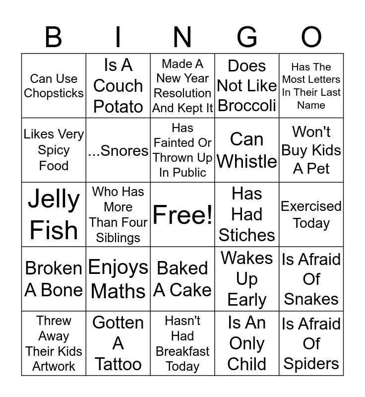 This bingo card has a free space and 48 words: Practices Martial Arts, Is Afraid Of Spiders, Is Left Handed, Hasn't Had Breakfast Today, Enjoys Maths, Won A Contest, Is A Couch Potato, Has Argued With A Friend Recently, Likes Very Spicy Food, Bites His/Her Fingernails, ...Snores, Does Not Like Broccoli, Is Afraid Of Snakes, Wakes Up Early, Wears Socks To Bed, Can Play A Musical Instrument, Has Fainted Or Thrown Up In Public, Has Had Stiches, Loves To Swim, Has The Most Letters In Their Last Name, Who Has More Than Four Siblings, Is An Only Child, Can Use Chopsticks, Can Whistle, Incomplete Baby Book, Won't Buy Kids A Pet, Threw Away Their Kids Artwork, Dyed My Hair, Baked A Cake, Broken A Bone, Had Braces, Lied About My Age, Fired A Gun, Made A Prank Call, Gotten A Tattoo, Locked My Keys In The Car, Been Skydiving, Exercised Today, Went On A Blind Date, Loves To Do Gardening, Still Watches Old Black & White Movies & TV Shows, Never Swears, Made A New Year Resolution And Kept It, Shaktiman, Jelly Fish, Soccers Stone, Thanos and Prefers Contact Lenses.