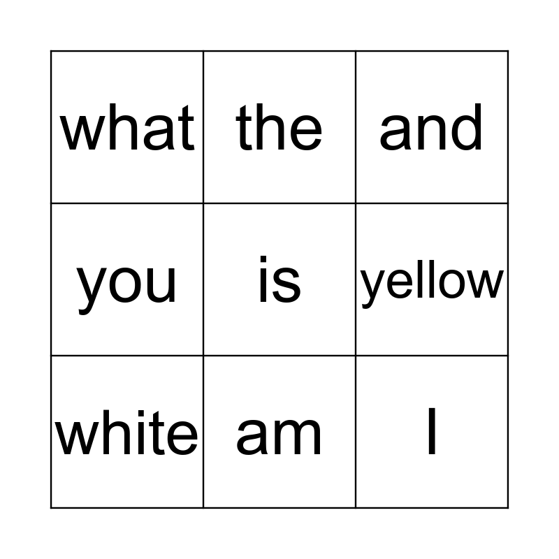 This bingo card has a free space and 11 words: blue, am, I, white, the, and, yellow, this, you, what and like.