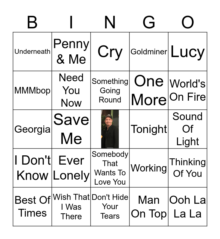 This bingo card has a free space and 24 words: Ever Lonely, Wish That I Was There, Something Going Round, Best Of Times, Lucy, Underneath, MMMbop, Penny & Me, Tonight, Somebody That Wants To Love You, One More, Georgia, Working, Thinking Of You, Need You Now, Man On Top, Sound Of Light, Cry, World's On Fire, Save Me, Ooh La La La, I Don't Know, Goldminer and Don't Hide Your Tears.