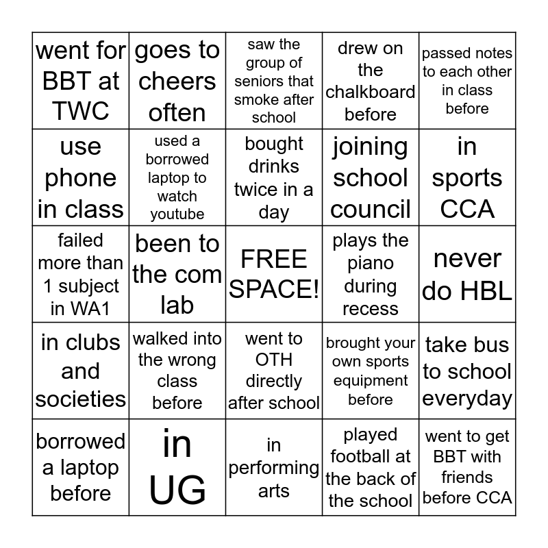 This bingo card has a free space and 24 words: borrowed a laptop before, walked into the wrong class before, bought drinks twice in a day, played football at the back of the school, passed notes to each other in class before, went for BBT at TWC, goes to cheers often, saw the group of seniors that smoke after school, plays the piano during recess, never do HBL, failed more than 1 subject in WA1, used a borrowed laptop to watch youtube, brought your own sports equipment before, take bus to school everyday, use phone in class, in UG, in performing arts, drew on the chalkboard before, in sports CCA, in clubs and societies, been to the com lab, went to OTH directly after school, joining school council and went to get BBT with friends before CCA.