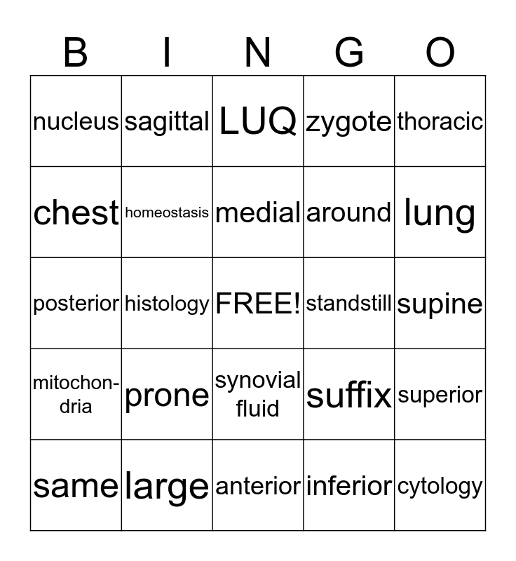 This bingo card has a free space and 24 words: prone, large, medial, same, thoracic, nucleus, chest, sagittal, standstill, synovial fluid, around, posterior, suffix, superior, homeostasis, inferior, supine, LUQ, lung, histology, cytology, mitochon-dria, zygote and anterior.