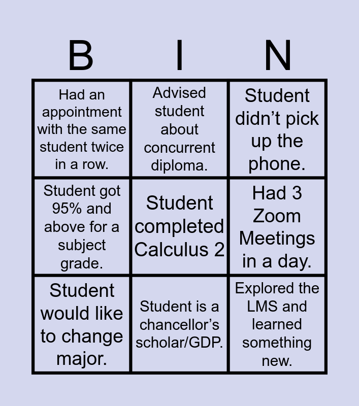 This bingo card has a free space and 8 words: Had 3 Zoom Meetings in a day., Student didn’t pick up the phone., Advised student about concurrent diploma., Student would like to change major., Had an appointment with the same student twice in a row., Explored the LMS and learned something new., Student got 95% and above for a subject grade. and Student is a chancellor’s scholar/GDP..
