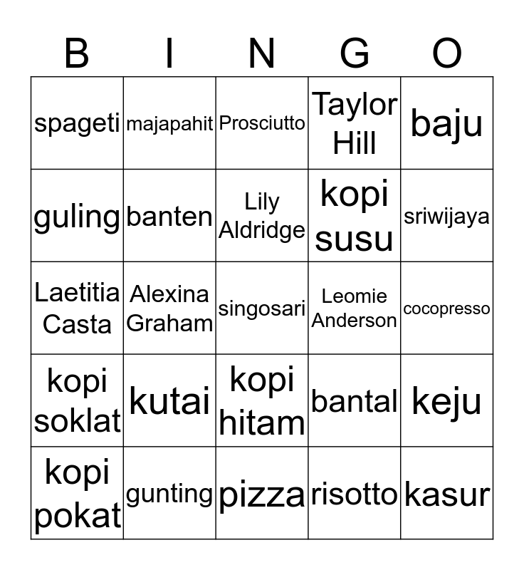 This bingo card has 25 words: kutai, pizza, Lily Aldridge, kopi pokat, baju, spageti, guling, majapahit, Leomie Anderson, kopi hitam, kopi susu, Laetitia Casta, bantal, keju, banten, kasur, cocopresso, Prosciutto, sriwijaya, Alexina Graham, singosari, gunting, kopi soklat, Taylor Hill and risotto.