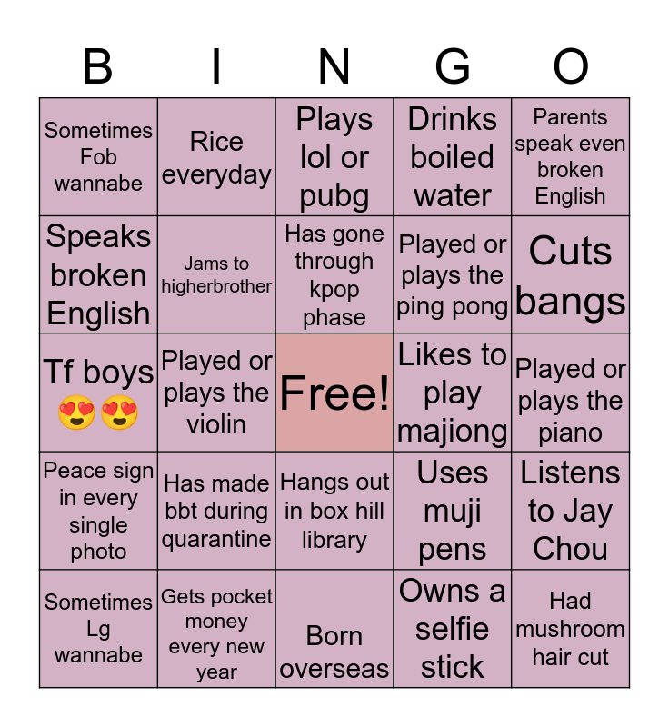 This bingo card has a free space and 24 words: Has made bbt during quarantine, Gets pocket money every new year, Has gone through kpop phase, Sometimes Lg wannabe, Parents speak even broken English, Sometimes Fob wannabe, Speaks broken English, Rice everyday, Likes to play majiong, Hangs out in box hill library, Played or plays the ping pong, Tf boys 😍😍, Uses muji pens, Listens to Jay Chou, Jams to higherbrother, Owns a selfie stick, Played or plays the piano, Plays lol or pubg, Cuts bangs, Played or plays the violin, Had mushroom hair cut, Peace sign in every single photo, Drinks boiled water and Born overseas.