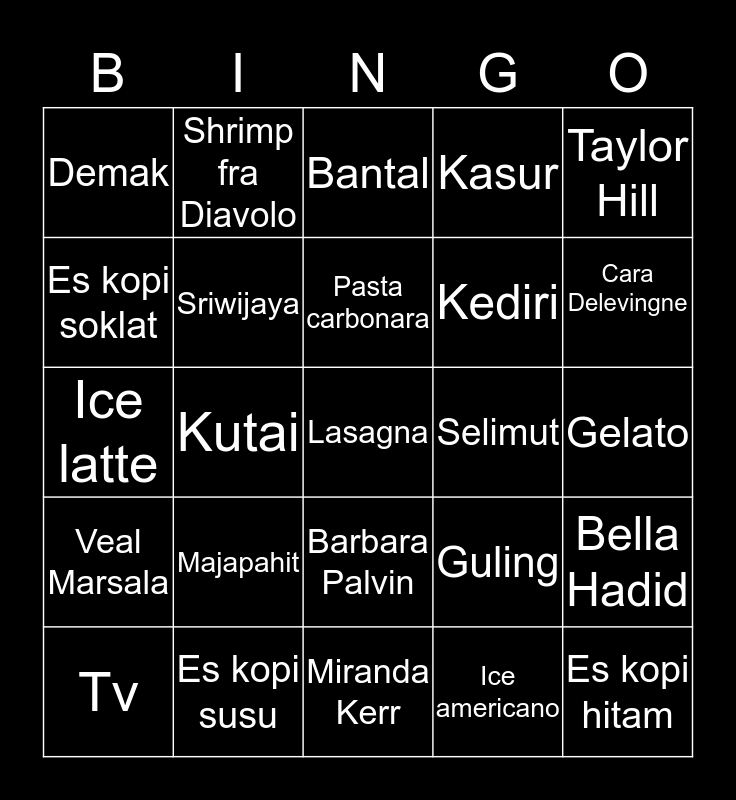This bingo card has a free space and 24 words: Majapahit, Es kopi susu, Pasta carbonara, Tv, Taylor Hill, Demak, Es kopi soklat, Shrimp fra Diavolo, Selimut, Barbara Palvin, Kediri, Ice latte, Guling, Bella Hadid, Sriwijaya, Ice americano, Gelato, Bantal, Cara Delevingne, Kutai, Es kopi hitam, Veal Marsala, Kasur and Miranda Kerr.