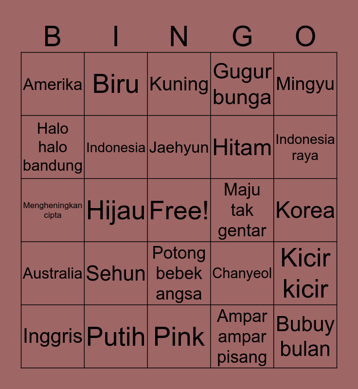 This bingo card has a free space and 25 words: Sehun, Pink, Jaehyun, Inggris, Mingyu, Amerika, Halo halo bandung, Biru, Maju tak gentar, Potong bebek angsa, Hitam, Mengheningkan cipta, Chanyeol, Kicir kicir, Indonesia, Eunwoo, Korea, Kuning, Indonesia raya, Hijau, Bubuy bulan, Putih, Australia, Gugur bunga and Ampar ampar pisang.