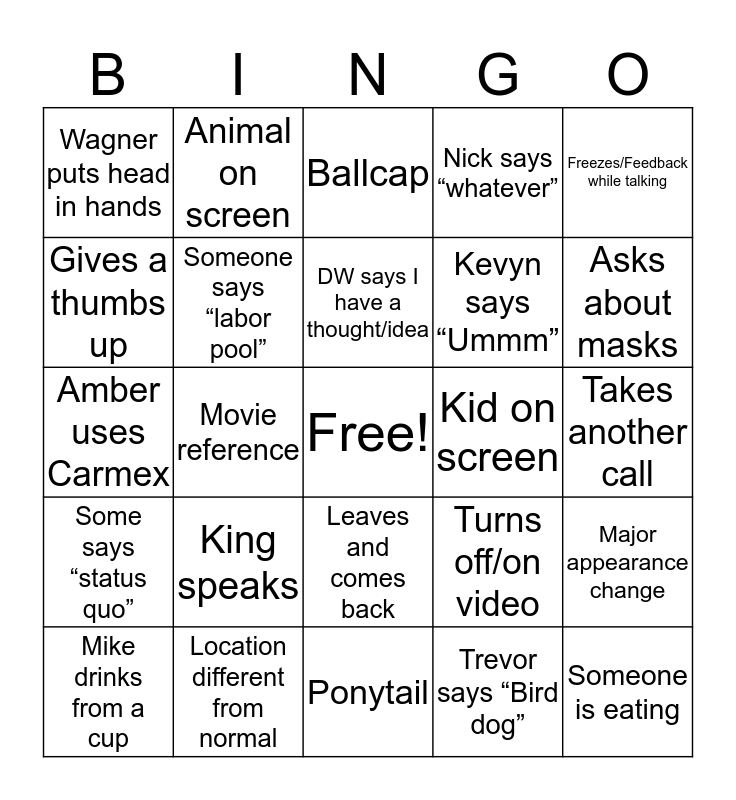 This bingo card has a free space and 25 words: King speaks, Ponytail, DW says I have a thought/idea, Mike drinks from a cup, Freezes/Feedback while talking, Wagner puts head in hands, Gives a thumbs up, Animal on screen, Kid on screen, Leaves and comes back, Kevyn says “Ummm”, Amber uses Carmex, Turns off/on video, Major appearance change, Someone says “labor pool”, Talks on mute, Takes another call, Ballcap, Asks about masks, Movie reference, Someone is eating, Location different from normal, Some says “status quo”, Nick says “whatever” and Trevor says “Bird dog”.