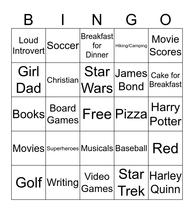 This bingo card has a free space and 24 words: Superheroes, Writing, Star Wars, Golf, Movie Scores, Loud Introvert, Girl Dad, Soccer, Pizza, Musicals, James Bond, Books, Baseball, Red, Christian, Star Trek, Harry Potter, Breakfast for Dinner, Cake for Breakfast, Board Games, Harley Quinn, Movies, Hiking/Camping and Video Games.