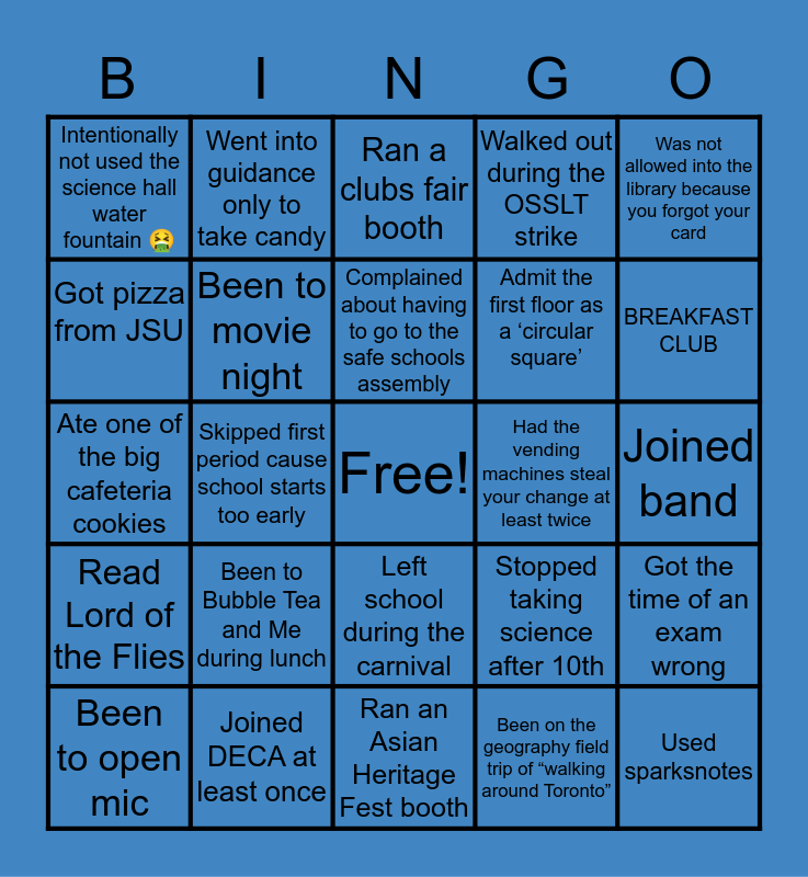 This bingo card has a free space and 24 words: Been to Bubble Tea and Me during lunch, Joined DECA at least once, Complained about having to go to the safe schools assembly, Been to open mic, Was not allowed into the library because you forgot your card, Intentionally not used the science hall water fountain 🤮, Got pizza from JSU, Went into guidance only to take candy, Had the vending machines steal your change at least twice, Left school during the carnival, Admit the first floor as a ‘circular square’, Ate one of the big cafeteria cookies, Stopped taking science after 10th, Got the time of an exam wrong, Been to movie night, Been on the geography field trip of “walking around Toronto”, Joined band, Ran a clubs fair booth, BREAKFAST CLUB, Skipped first period cause school starts too early, Used sparksnotes, Read Lord of the Flies, Walked out during the OSSLT strike and Ran an Asian Heritage Fest booth.