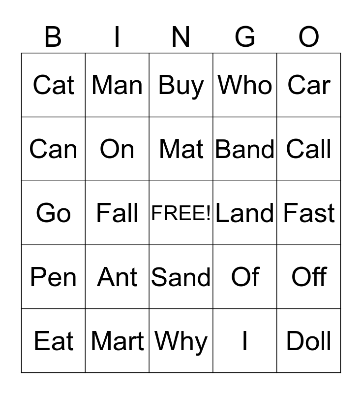 This bingo card has a free space and 24 words: Ant, Mart, Mat, Eat, Car, Cat, Can, Man, Land, Sand, Band, Go, Of, Off, On, I, Fast, Buy, Call, Fall, Doll, Pen, Who and Why.
