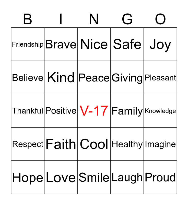 This bingo card has a free space and 24 words: Faith, Love, Peace, Hope, Joy, Friendship, Believe, Brave, Family, Cool, Giving, Thankful, Healthy, Imagine, Kind, Laugh, Knowledge, Nice, Pleasant, Positive, Proud, Respect, Safe and Smile.
