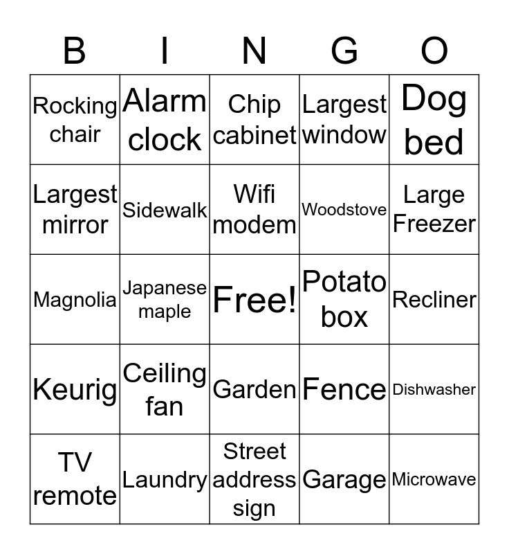 This bingo card has a free space and 24 words: Ceiling fan, Laundry, Wifi modem, TV remote, Dog bed, Rocking chair, Largest mirror, Alarm clock, Potato box, Garden, Woodstove, Magnolia, Fence, Dishwasher, Sidewalk, Garage, Recliner, Chip cabinet, Large Freezer, Japanese maple, Microwave, Keurig, Largest window and Street address sign.
