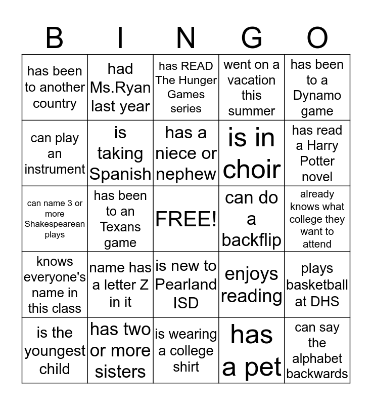 This bingo card has a free space and 24 words: name has a letter Z in it, has two or more sisters, has a niece or nephew, is the youngest child, has been to a Dynamo game, has been to another country, can play an instrument, had Ms.Ryan last year, can do a backflip, is new to Pearland ISD, is in choir, can name 3 or more Shakespearean plays, enjoys reading, plays basketball at DHS, is taking Spanish, has a pet, already knows what college they want to attend, has READ The Hunger Games series, has read a Harry Potter novel, has been to an Texans game, can say the alphabet backwards, knows everyone's name in this class, went on a vacation this summer and is wearing a college shirt.
