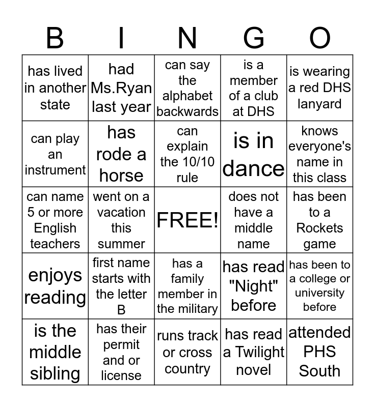 This bingo card has a free space and 24 words: first name starts with the letter B, has their permit and or license, can explain the 10/10 rule, is the middle sibling, is wearing a red DHS lanyard, has lived in another state, can play an instrument, had Ms.Ryan last year, does not have a middle name, has a family member in the military, is in dance, can name 5 or more English teachers, has read "Night" before, has been to a college or university before, has rode a horse, has read a Twilight novel, has been to a Rockets game, can say the alphabet backwards, knows everyone's name in this class, went on a vacation this summer, attended PHS South, enjoys reading, is a member of a club at DHS and runs track or cross country.