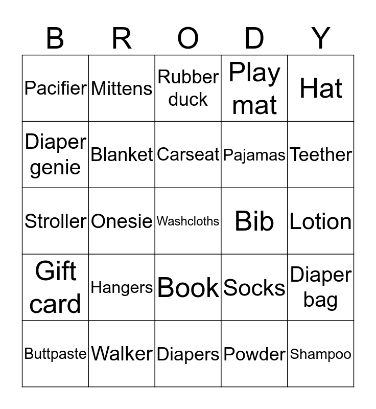 This bingo card has a free space and 31 words: Diapers, Wipes, Onesie, Bottle, Pacifier, Rubber duck, Blanket, Socks, Bib, Powder, Lotion, Shampoo, Rattle, Burp cloth, Teether, Homemade item, Diaper bag, Hangers, Gift card, Book, Hat, Shoes, Buttpaste, Mittens, Pajamas, Diaper genie, Play mat, Stroller, Walker, Carseat and Bouncer.