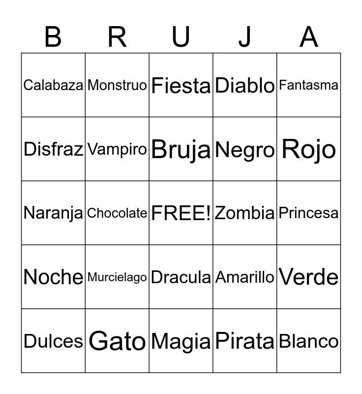 This bingo card has a free space and 24 words: Murcielago, Gato, Bruja, Dulces, Fantasma, Calabaza, Disfraz, Monstruo, Zombia, Dracula, Negro, Naranja, Amarillo, Verde, Vampiro, Pirata, Princesa, Fiesta, Rojo, Chocolate, Blanco, Noche, Diablo and Magia.