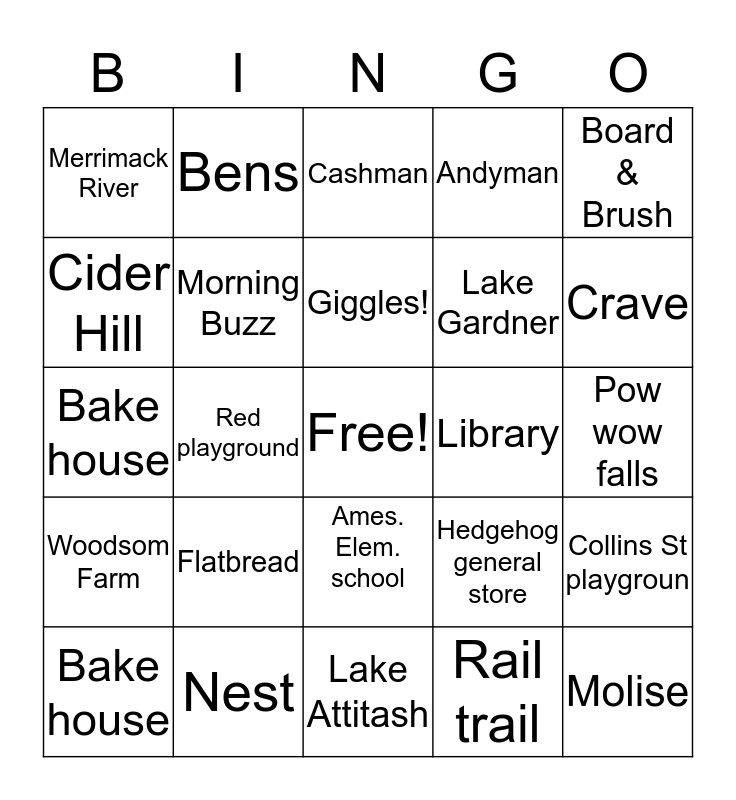 This bingo card has a free space and 24 words: Flatbread, Nest, Giggles!, Bake house, Board & Brush, Merrimack River, Cider Hill, Bens, Library, Ames. Elem. school, Lake Gardner, Bake house, Hedgehog general store, Collins St playgroun, Morning Buzz, Rail trail, Pow wow falls, Cashman, Crave, Red playground, Molise, Woodsom Farm, Andyman and Lake Attitash.