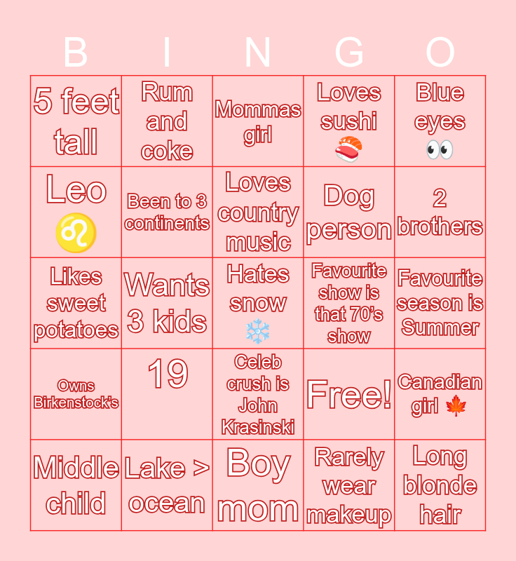 This bingo card has 25 words: 19, Boy mom, Loves country music, Middle child, Blue eyes 👀, 5 feet tall, Leo ♌️, Rum and coke, Favourite show is that 70’s show, Celeb crush is John Krasinski, Dog person, Likes sweet potatoes, Free!, Canadian girl 🍁, Been to 3 continents, Long blonde hair, Favourite season is Summer, Mommas girl, 2 brothers, Wants 3 kids, Hates snow ❄️, Lake > ocean, Owns Birkenstock’s, Loves sushi 🍣 and Rarely wear makeup.