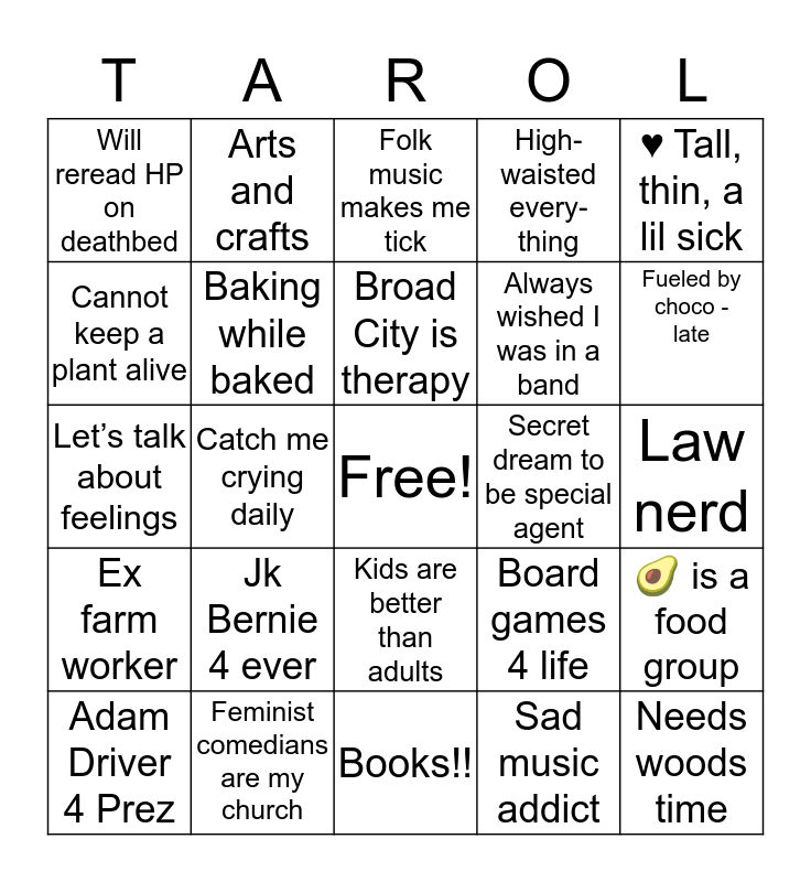This bingo card has a free space and 24 words: Adam Driver 4 Prez, Jk Bernie 4 ever, Broad City is therapy, Sad music addict, ♥️ Tall, thin, a lil sick, Will reread HP on deathbed, Arts and crafts, Folk music makes me tick, Secret dream to be special agent, Law nerd, Let’s talk about feelings, Baking while baked, Board games 4 life, 🥑 is a food group, Cannot keep a plant alive, Feminist comedians are my church, Books!!, High- waisted every- thing, Fueled by choco -late, Ex farm worker, Catch me crying daily, Kids are better than adults, Always wished I was in a band and Needs woods time.