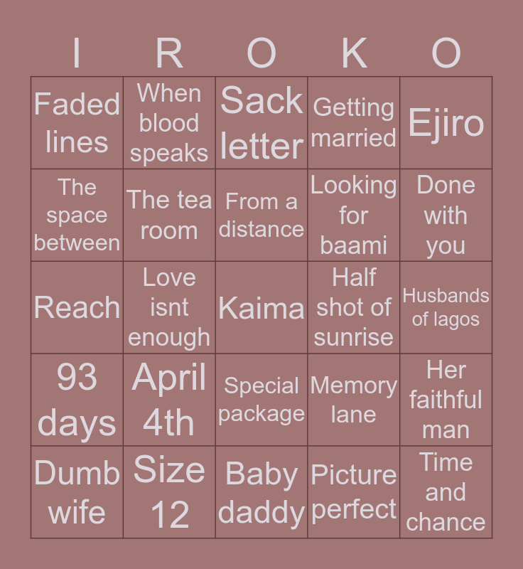 This bingo card has a free space and 24 words: April 4th, Size 12, From a distance, Dumb wife, Ejiro, Faded lines, The space between, When blood speaks, Half shot of sunrise, Special package, Looking for baami, Reach, Memory lane, Her faithful man, The tea room, Picture perfect, Husbands of lagos, Sack letter, Done with you, Love isnt enough, Time and chance, 93 days, Getting married and Baby daddy.