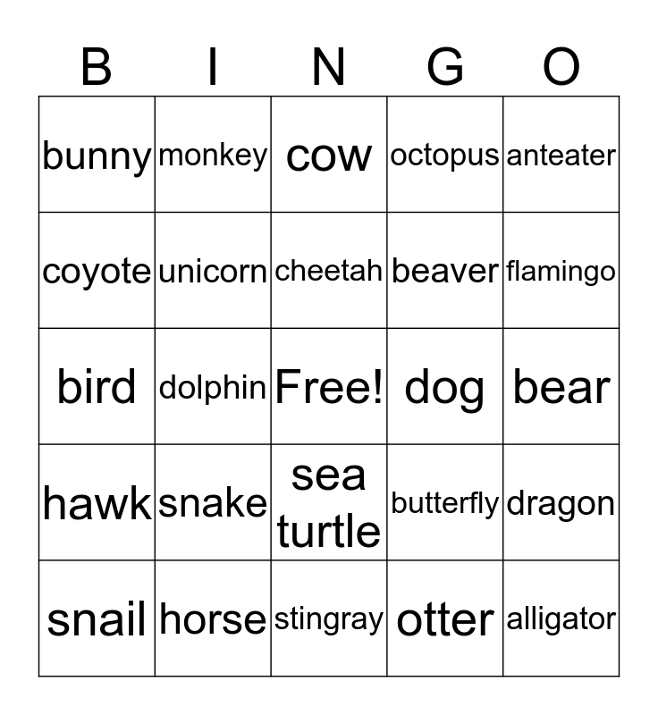 This bingo card has a free space and 38 words: shark, zebra, sloth, unicorn, dragon, snake, cheetah, llama, anteater, beaver, dolphin, octopus, alligator, bear, coyote, hawk, owl, cow, elephant, dog, bunny, horse, flamingo, snail, lion, stingray, chicken, duck, meerkat, giraffe, tiger, sea turtle, otter, monkey, ferrett, butterfly, bird and pig.