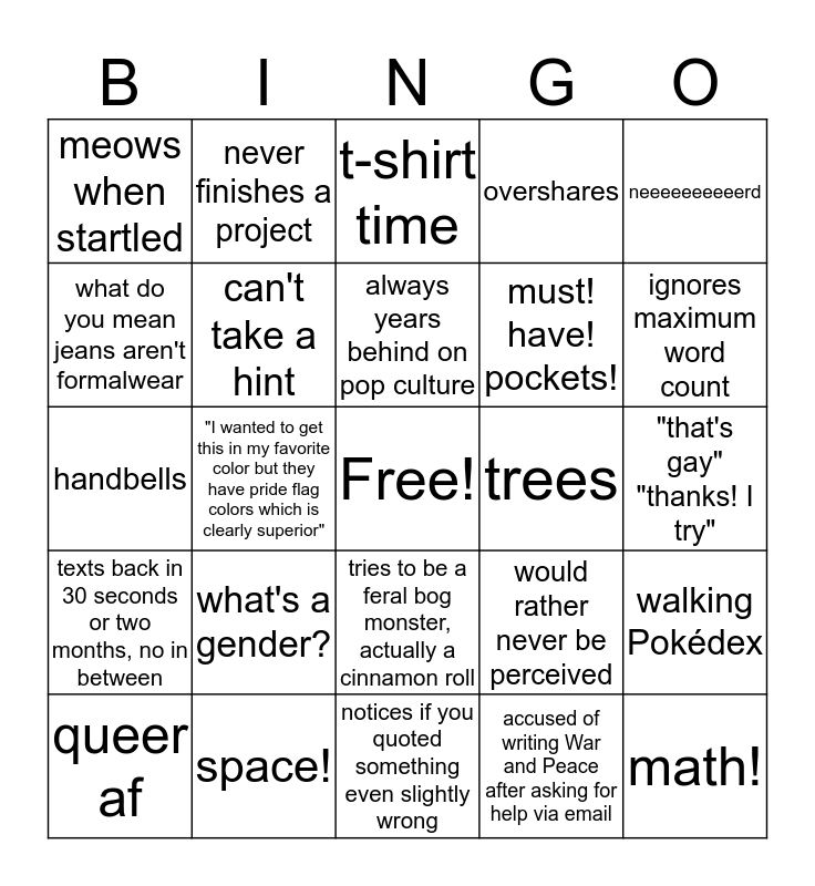 This bingo card has a free space and 44 words: what's a sleep schedule?, math!, claims to love reading, hasn't finished a book in five years, queer af, nonstop multi-texter, accused of writing War and Peace after asking for help via email, t-shirt time, dragon lover, neeeeeeeeeerd, space!, overshares, trees, tries to be a feral bog monster, actually a cinnamon roll, what's a gender?, this cat chose me I'm the most blessed person ever, notices if you quoted something even slightly wrong, Opinions(tm), handbells, wants to be in college again until meeting current college students, ignores maximum word count, never finishes a project, "fun fact!" (explains new problem), polyamoryoryory, meows when startled, has 20 favorite Pokémon, "that's gay" "thanks! I try", half of That Couple(tm), can't be anonymous even when trying, would rather never be perceived, texts back in 30 seconds or two months, no in between, has too many Duolingo courses at level two or three, walking Pokédex, wants to hike the AT, has trouble walking two miles without taking a break, phone lost = brain lost, "I wanted to get this in my favorite color but they have pride flag colors which is clearly superior", always drinking soda, need my daily caffeine, tumblr fiend, always years behind on pop culture, what do you mean jeans aren't formalwear, must! have! pockets!, only focused at inconvenient times, can't take a hint and can be bribed with chocolate (or any food).