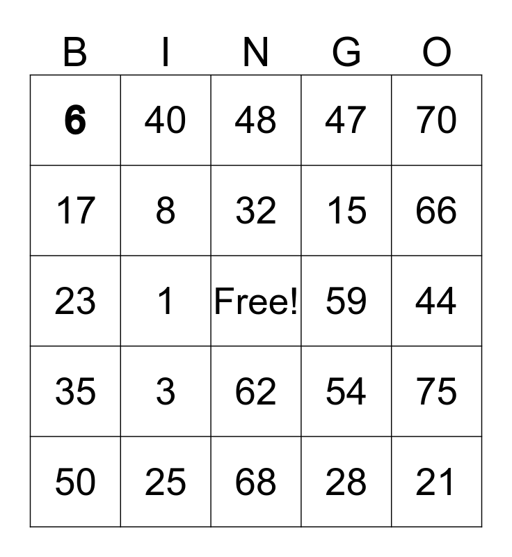 This bingo card has a free space and 24 words: 3, 25, 32, 50, 70, 6, 17, 40, 59, 62, 15, 23, 54, 75, 8, 28, 44, 48, 66, 1, 21, 35, 47 and 68.