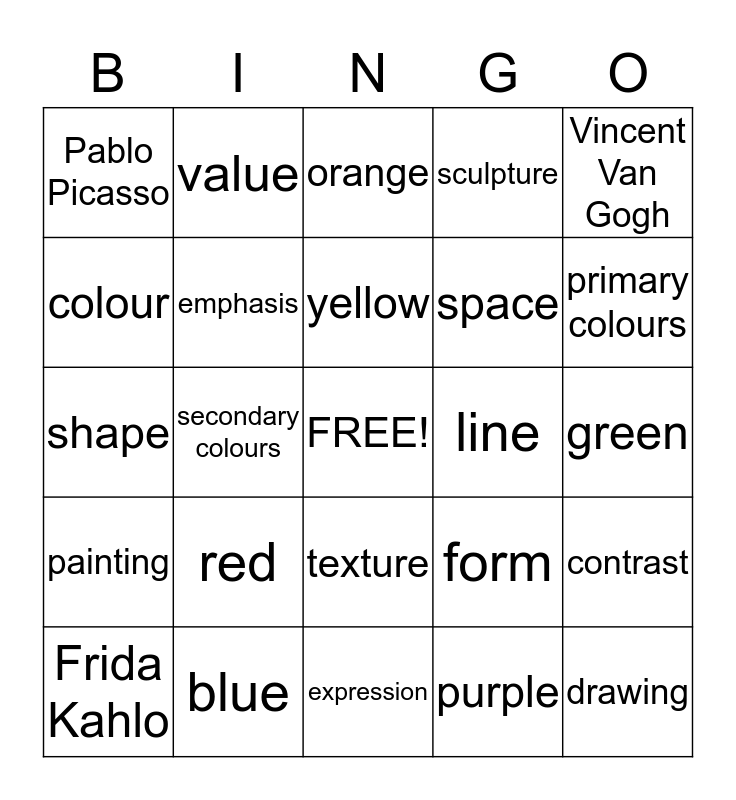 This bingo card has a free space and 24 words: red, blue, yellow, Frida Kahlo, Vincent Van Gogh, Pablo Picasso, colour, value, line, texture, space, shape, form, contrast, emphasis, purple, green, orange, primary colours, secondary colours, drawing, painting, sculpture and expression.