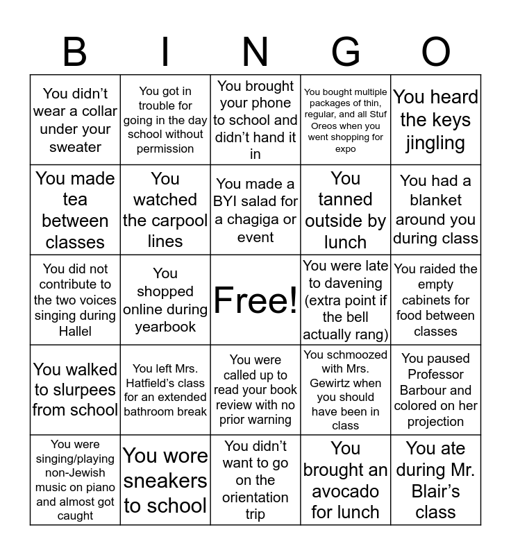 This bingo card has a free space and 34 words: You were told to “put something in your hair”, You brought an avocado for lunch, You touched the door, You forgot it was Rosh Chodesh and wore your uniform, You walked to slurpees from school, You watched the carpool lines, You heard the keys jingling, You were singing/playing non-Jewish music on piano and almost got caught, You got in trouble for going in the day school without permission, You ditched class in a different grade’s room, You made a BYI salad for a chagiga or event, You brought your phone to school and didn’t hand it in, You had a meeting about how your school year went, You wore leggings to school without boots, You were late to davening (extra point if the bell actually rang), You had a blanket around you during class, You wore sneakers to school, You did not contribute to the two voices singing during Hallel, You left Mrs. Hatfield’s class for an extended bathroom break, You schmoozed with Mrs. Gewirtz when you should have been in class, You were called up to read your book review with no prior warning, You were asked to speak at school Shabbos (extra point if you declined), You didn’t wear a collar under your sweater, You raided the empty cabinets for food between classes, You didn’t want to go on the orientation trip, You ate during Mr. Blair’s class, You bought multiple packages of thin, regular, and all Stuf Oreos when you went shopping for expo, You were asked to “say some words” about your recent trip/convention, You tanned outside by lunch, You made tea between classes, You went to visit PK-3 during class, You shopped online during yearbook, You paused Professor Barbour and colored on her projection and You were told by a teacher, “I’m sure a meforash somewhere says that”.