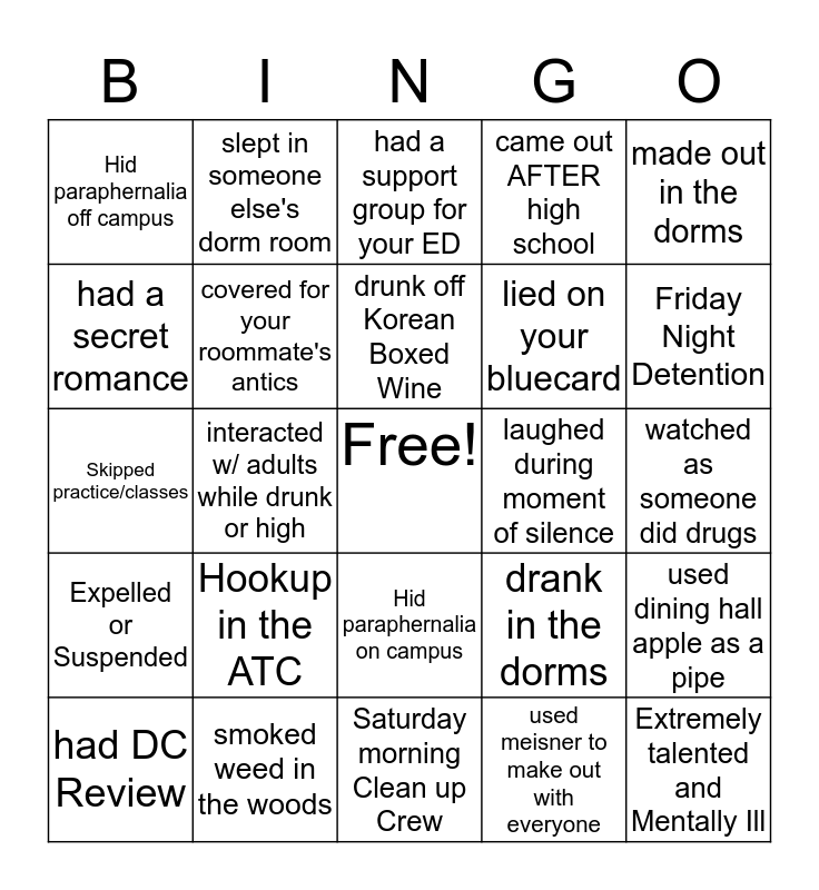 This bingo card has a free space and 24 words: Hookup in the ATC, smoked weed in the woods, drunk off Korean Boxed Wine, had DC Review, made out in the dorms, Hid paraphernalia off campus, had a secret romance, slept in someone else's dorm room, laughed during moment of silence, Hid paraphernalia on campus, lied on your bluecard, Skipped practice/classes, drank in the dorms, used dining hall apple as a pipe, covered for your roommate's antics, used meisner to make out with everyone, watched as someone did drugs, had a support group for your ED, Friday Night Detention, interacted w/ adults while drunk or high, Extremely talented and Mentally Ill, Expelled or Suspended, came out AFTER high school and Saturday morning Clean up Crew.