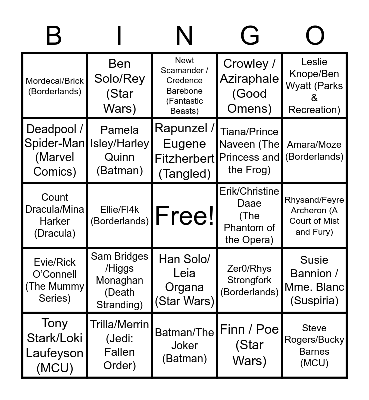 This bingo card has a free space and 24 words: Tony Stark/Loki Laufeyson (MCU), Sam Bridges /Higgs Monaghan (Death Stranding), Rapunzel / Eugene Fitzherbert (Tangled), Finn / Poe (Star Wars), Leslie Knope/Ben Wyatt (Parks & Recreation), Mordecai/Brick (Borderlands), Ben Solo/Rey (Star Wars), Newt Scamander / Credence Barebone (Fantastic Beasts), Erik/Christine Daae (The Phantom of the Opera), Rhysand/Feyre Archeron (A Court of Mist and Fury), Count Dracula/Mina Harker (Dracula), Pamela Isley/Harley Quinn (Batman), Zer0/Rhys Strongfork (Borderlands), Susie Bannion / Mme. Blanc (Suspiria), Deadpool / Spider-Man (Marvel Comics), Trilla/Merrin (Jedi: Fallen Order), Batman/The Joker (Batman), Crowley / Aziraphale (Good Omens), Amara/Moze (Borderlands), Evie/Rick O’Connell (The Mummy Series), Ellie/Fl4k (Borderlands), Han Solo/ Leia Organa (Star Wars), Tiana/Prince Naveen (The Princess and the Frog) and Steve Rogers/Bucky Barnes (MCU).